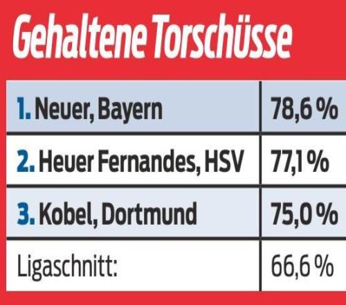 《体育图片报》援引德甲官方数据对本赛季截至目前德甲各队门将的扑救数据进行了统计,结果显示,老将诺伊尔以78.6%的成功率位列榜首(11/14)。排名第二的是升班马汉堡门将霍伊尔-费尔南德斯,他的扑救成功率为77.1%;多特蒙德门将科贝尔则以75%的成功率位列第三。