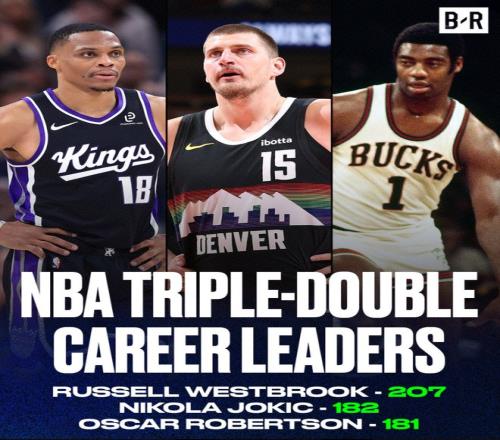 这场比赛也是约基奇的里程碑之夜,他完成生涯第182次三双升至历史第二位,在他之前只剩下威少,奥斯卡-罗伯特森181次三双正式被超越。