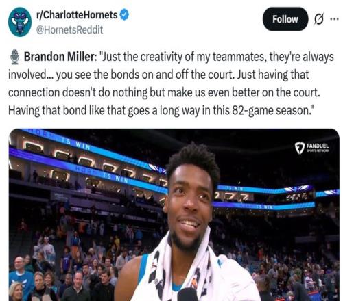 米勒赛后坦言身旁的队友都创造力十足,并且一直很投入,球员之间场上场下拥有这样的羁绊,只会让球队变得越来越强,在漫长的82场常规赛中,这样的凝聚力至关重要,是球队走得更远的底气所在。